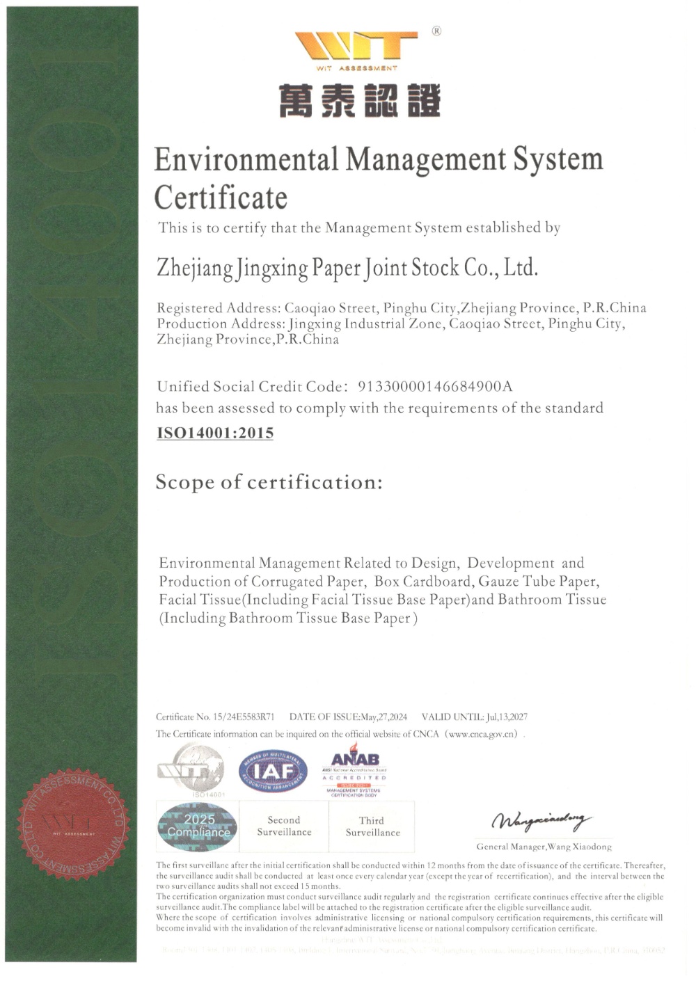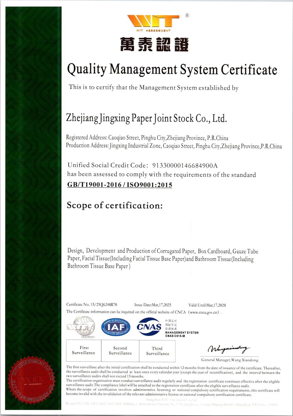 Jingxing Paper took the lead in the same industry to pass the ISO9001 quality management system and ISO14001 environmental management system certification, in 2014 passed the OHSAS18001 occupational health and safety management system certification, in 2015 passed GB / T23331 energy management system and FSC® forest system certification, passed in 2018 Certification of integration management of two industries.